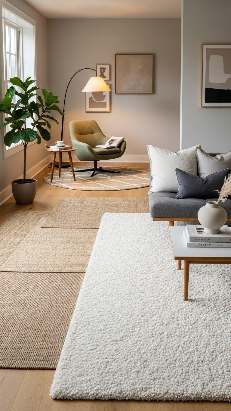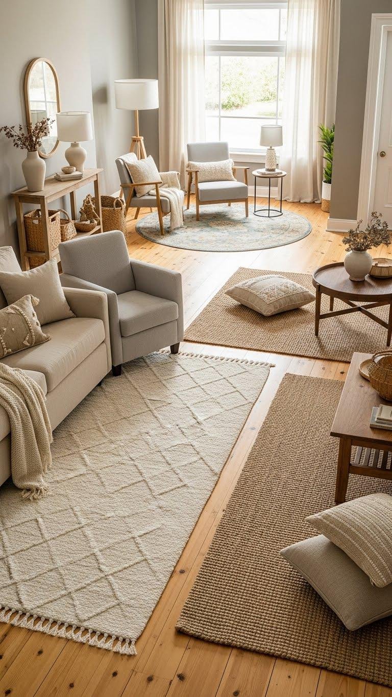 Bring layered, neutral rugs together to carve out intimate zones without interrupting a room’s flow. You can anchor a reading nook, seating cluster, or entry using varying textures and subtle tones, so the eye moves freely.