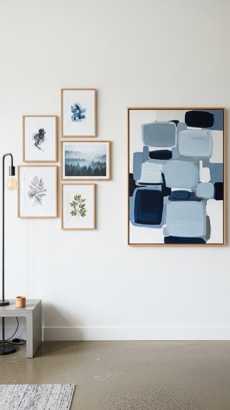 Use asymmetrical spacing to keep the layout modern and airy, letting each work breathe while reflecting your calm, unfettered taste.