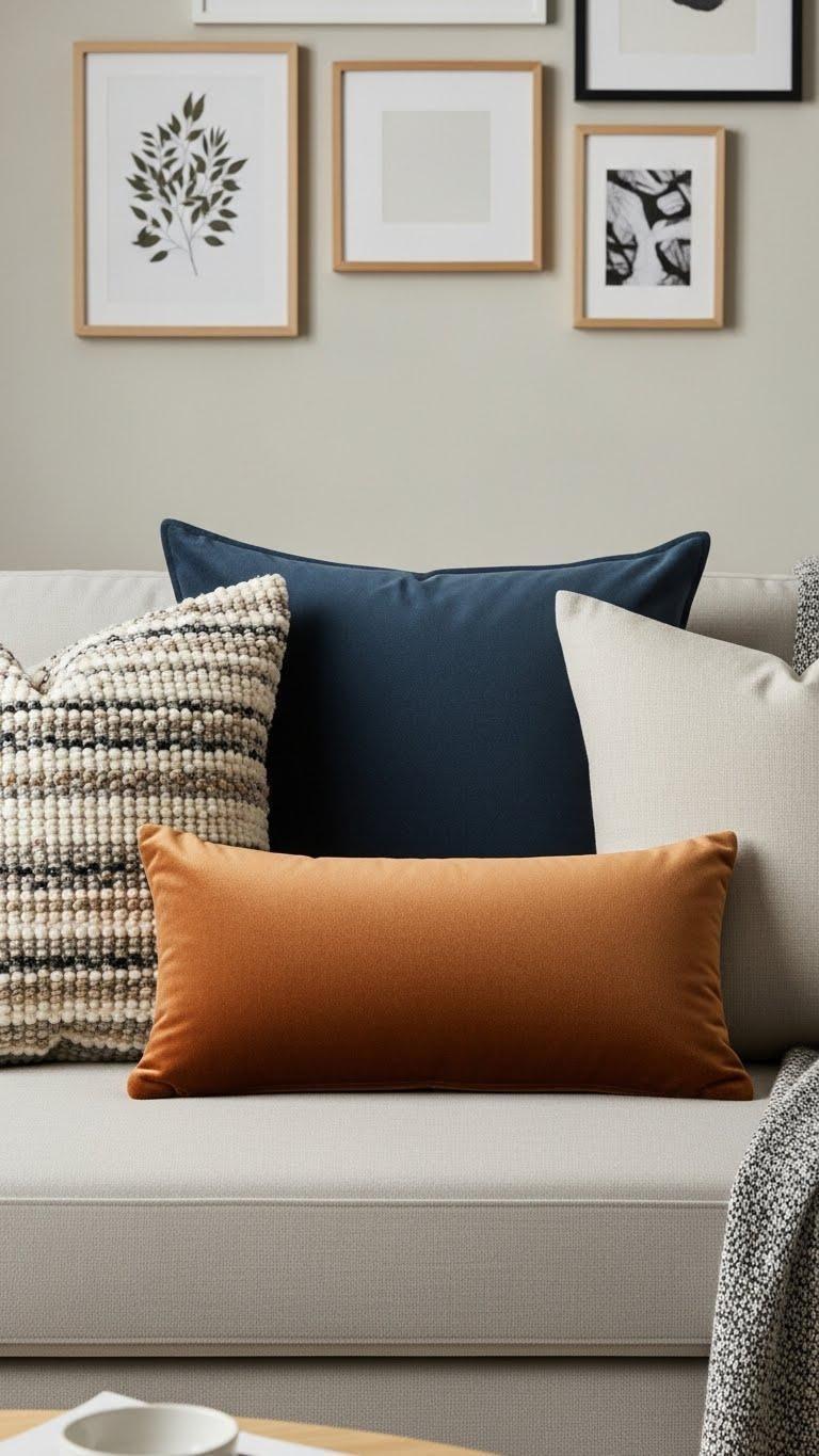 After you’ve curated a calm gallery wall, bring that same restrained confidence to your sofa with throw pillows in varying textures and tones. Mix a bouclé bolster, a velvet lumbar and matte linen squares to layer depth without clutter. Choose a muted palette with one warm accent, vary scale and pile, and let tactile contrast create cozy freedom and modern restraint.