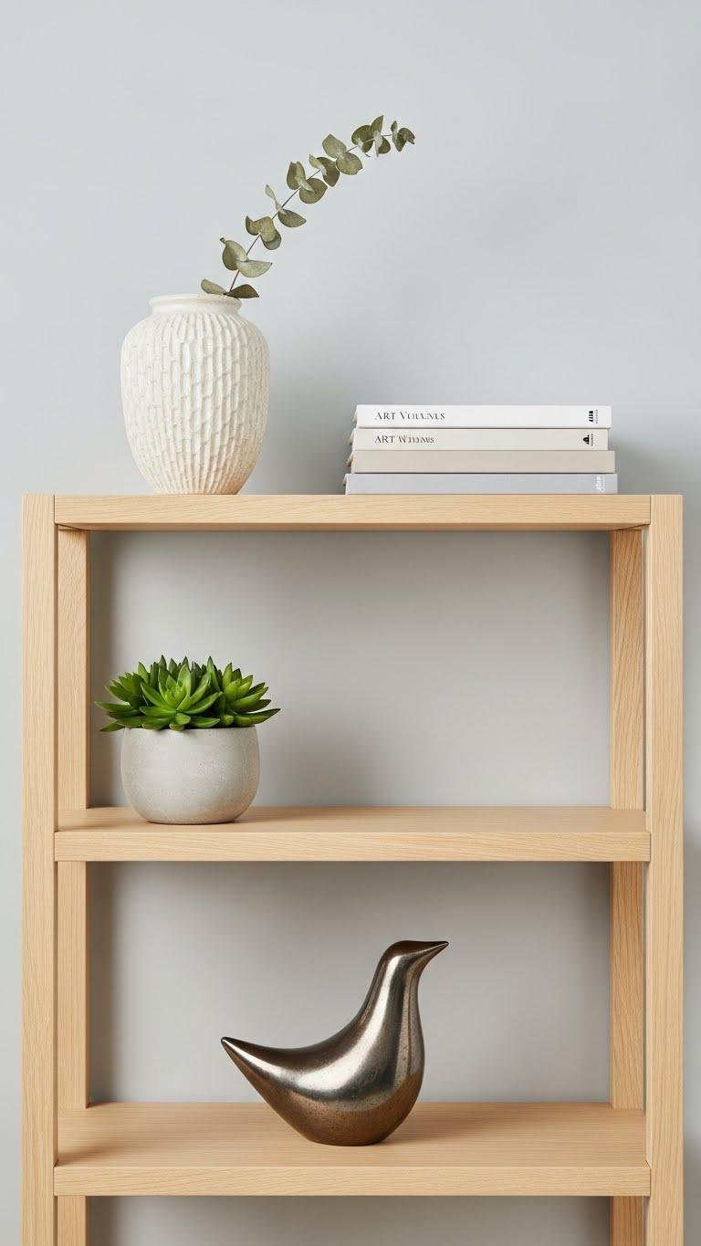 You favor curated vignettes over crowded displays, applying airy spacing and negative balance to highlight texture and color.