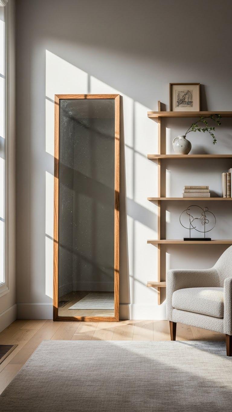 Open shelving’s quiet restraint sets the stage for another simple trick that multiplies light and openness: a large mirror. You’ll choose placement to capture morning sun and expand sightlines; consider an antique mirror for character or sleek frames for minimalism. Opt for beveled glass to refract light subtly. Hang securely, lean when allowed, and let reflection create roomy, free-feeling calm.