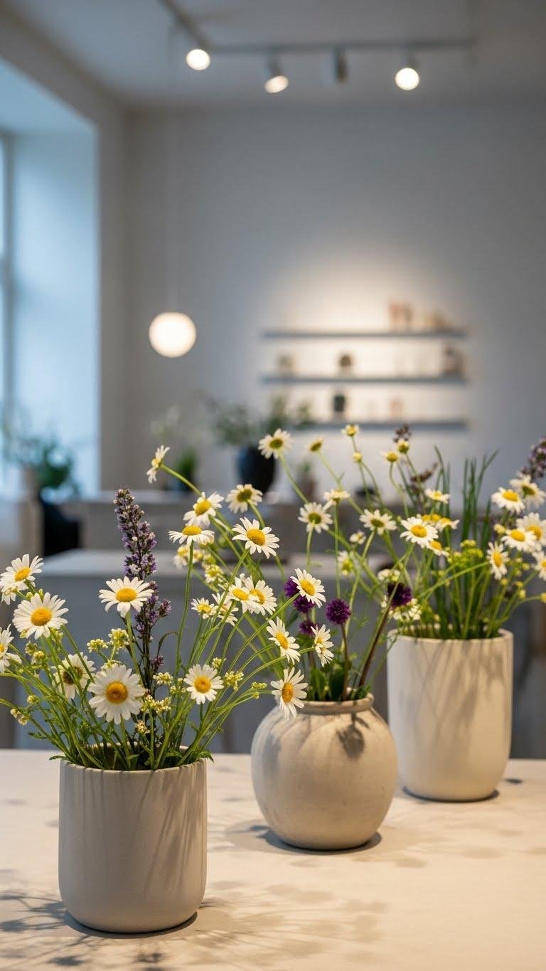 Bring in daisies or other simple blooms to soften a room’s edges and refresh its palette—choose neutral containers like matte stoneware, unglazed clay, or linen-wrapped glass to let the flowers sing without competing. You’ll pair fresh stems with dried or pressed daisies for layered texture, embrace seasonal foraging for authentic finds, and arrange loosely for an effortless, liberated aesthetic that still feels curated and modern.