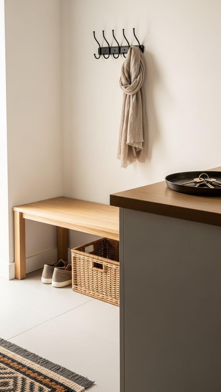 You keep counters minimal, honor a shoe free policy with a neat bench and basket, and swap a seasonal doormat for visual refresh.