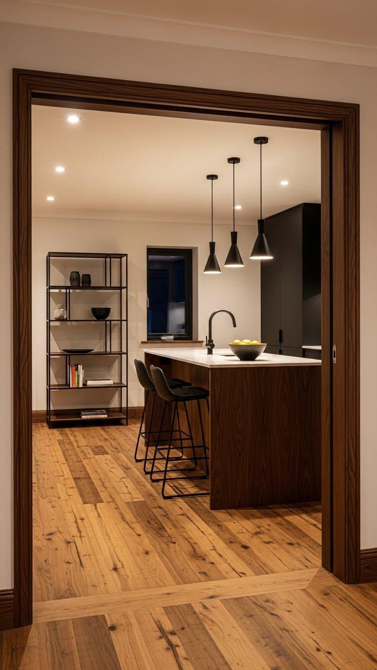 You’ll choose reclaimed timber floors or walnut trim, balance matte black fixtures, and add iron accents for contrast.