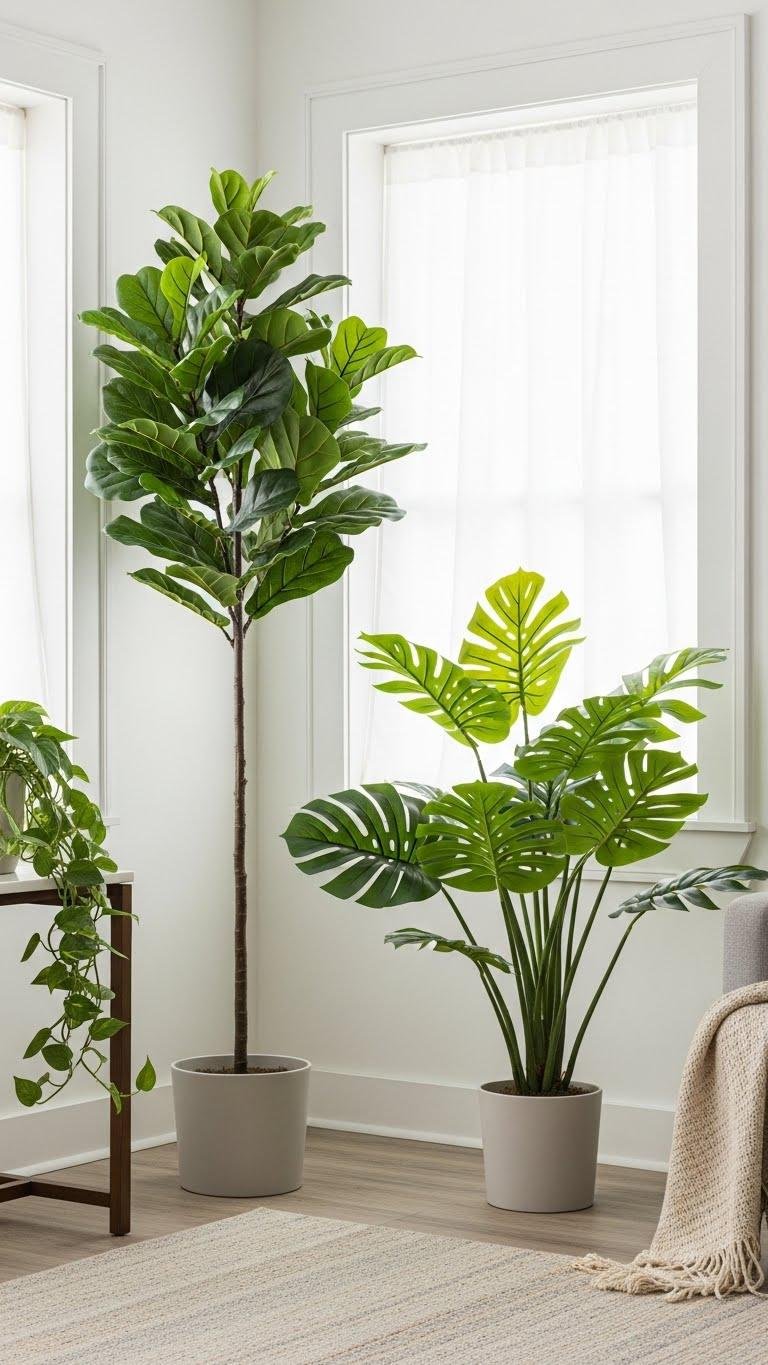 A dramatic fiddle-leaf fig or a sculptural monstera can anchor a room the way art does, giving you a living focal point that adds height, texture, and seasonal interest.