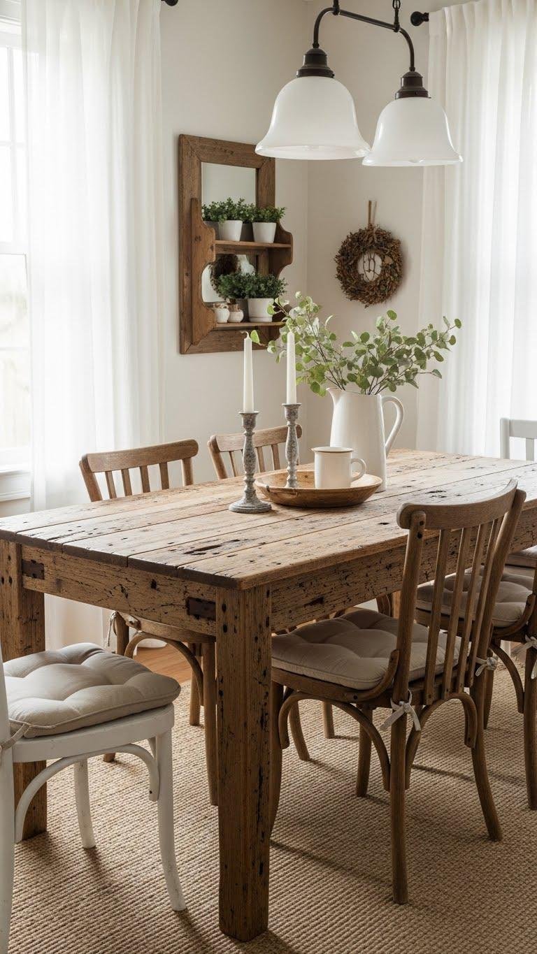 Pairing airy white curtains with a sturdy distressed farmhouse table grounds the lightness with tactile warmth and history. You’ll choose reclaimed wood for authenticity, favoring a weathered finish that shows knots and repairs rather than hiding them. Position it as a communal anchor where simple rituals unfold; its honest patina invites relaxed living while staying current with pared-back, freedom-focused design trends.