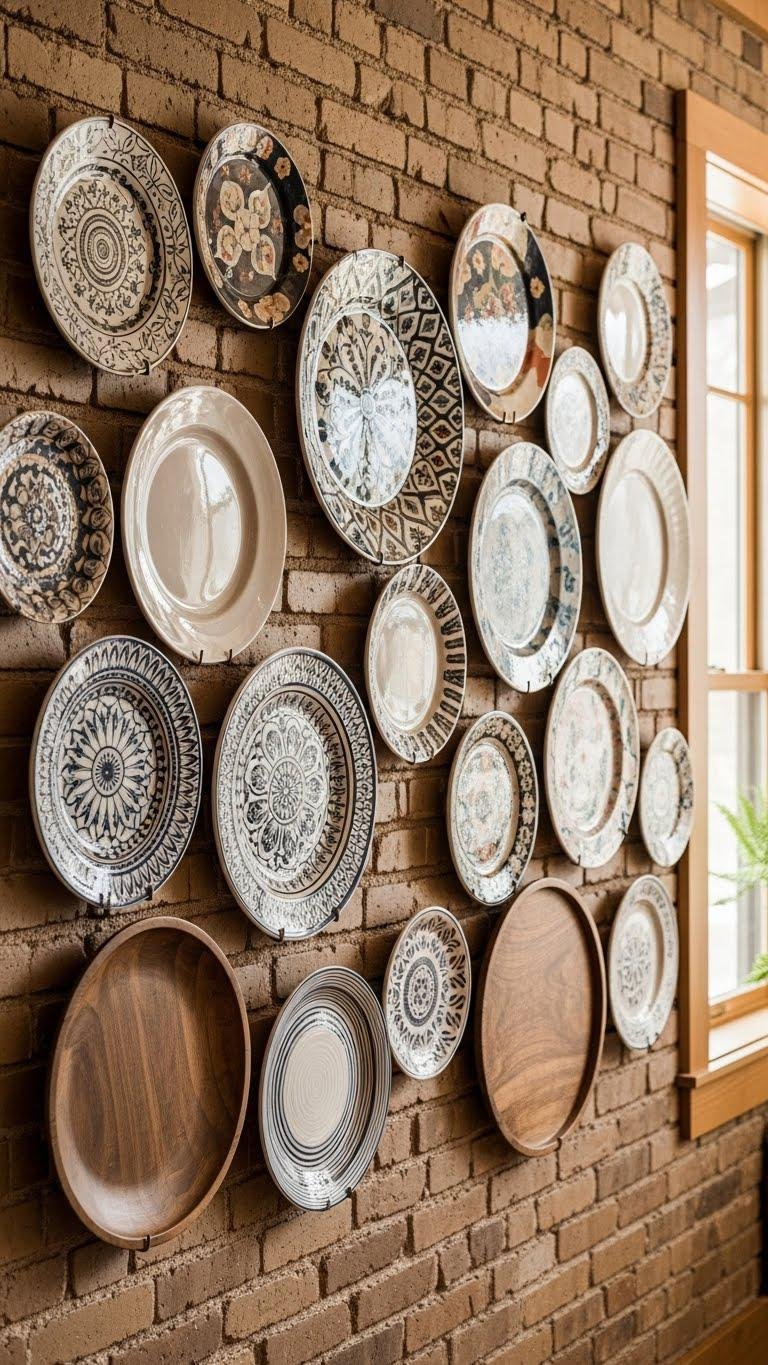 A curated wall of plates or platters turns ordinary serveware into effortless art you can change with the seasons. You’ll mix patterns, textures and a few rustic platters to ground the look, then plan an asymmetrical arrangement that feels spontaneous yet intentional.