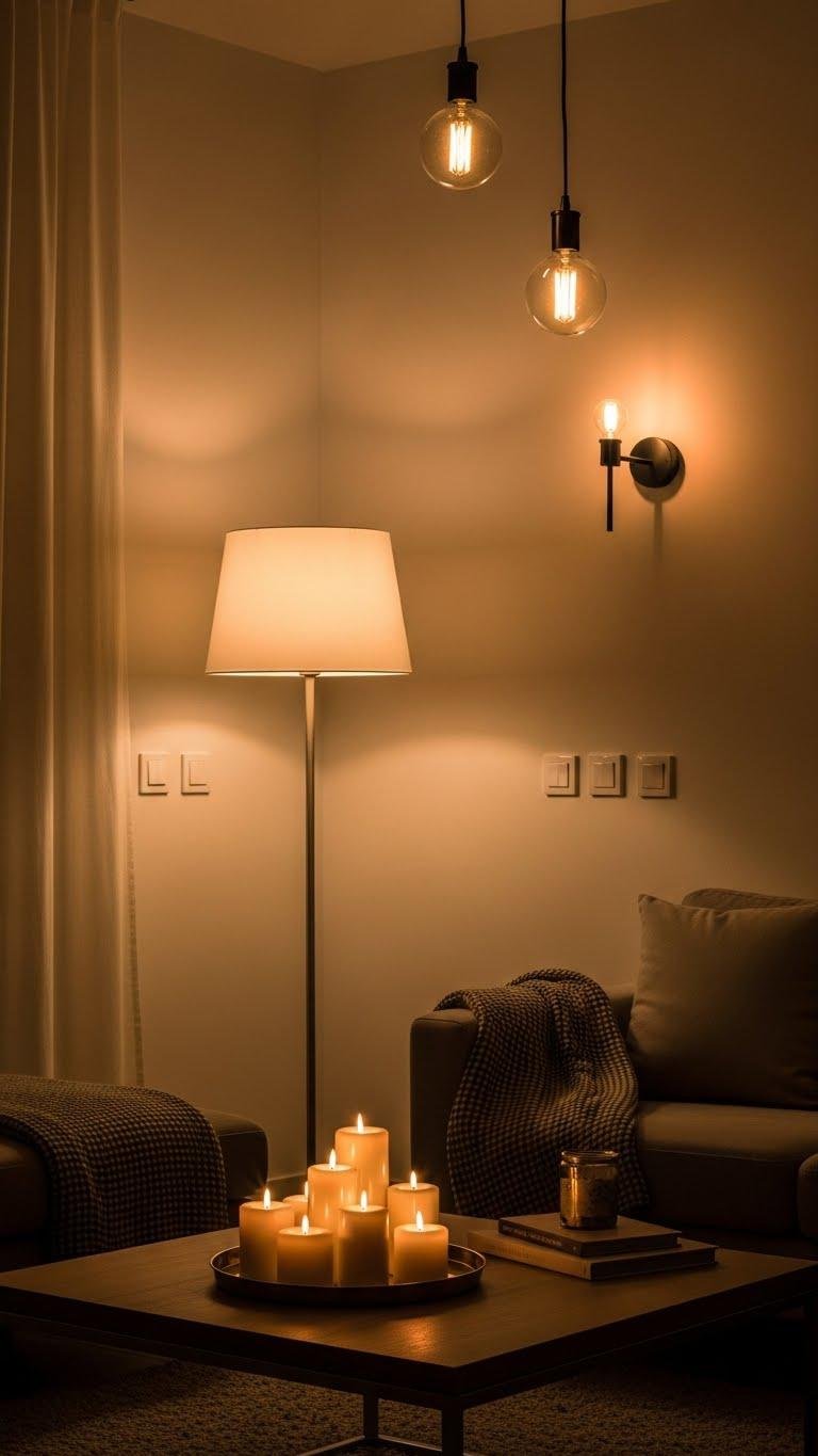 You’ll mix floor lamps, wall sconces, and small pendants, place candle clusters for warmth, and fit dimmer switches to tune mood and energy use.