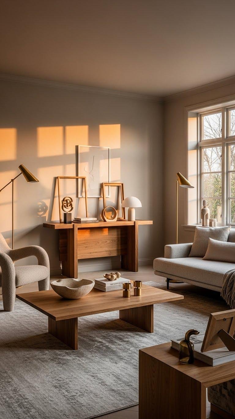 You’ll choose warm greige walls with a subtle sunset undertone, pair minimalist furnishings, and leave airy negative space.