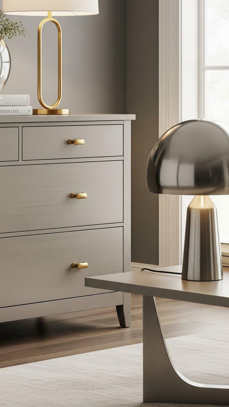 When you introduce metallic finishes sparingly, they lend a quiet glamour that reads modern without shouting—think matte brass drawer pulls, soft-gold lamp stems, or a brushed nickel coffee table base that catches light without glare.