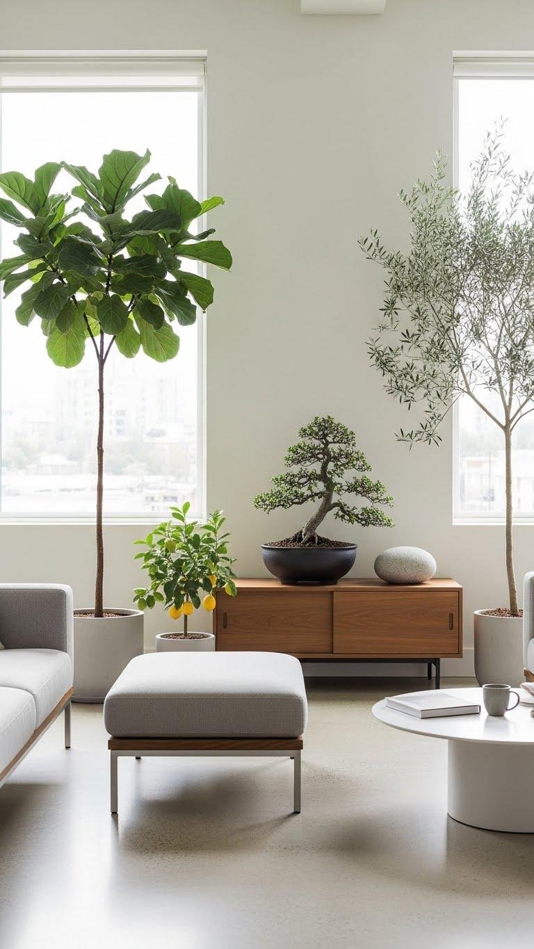 You’ll pick a tall fiddle leaf fig for bold vertical drama or a slender olive tree for Mediterranean calm.