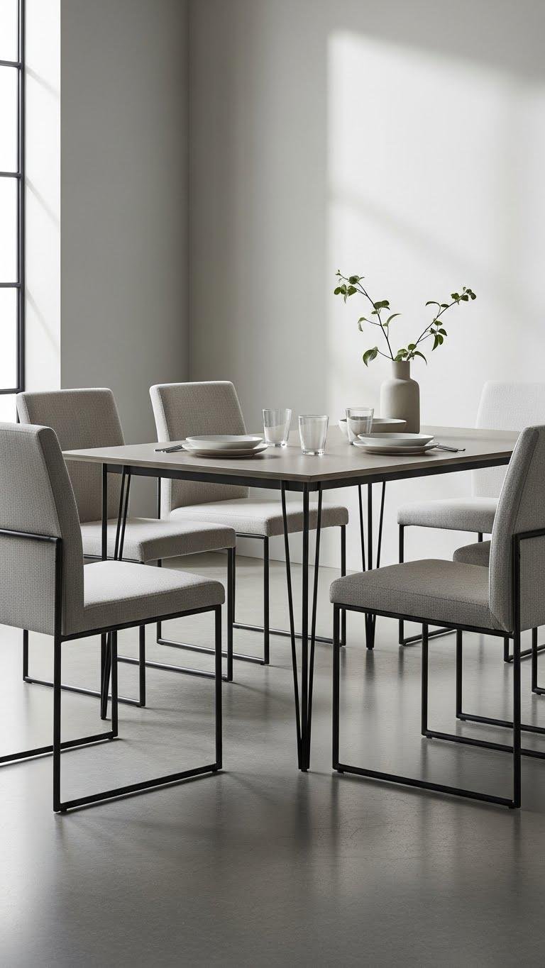 Anchor your minimalist living area with a streamlined dining table that reads as sculptural yet functional — thin-profile legs, a matte or warm wood top, and clean edges that let the chairs take center stage.