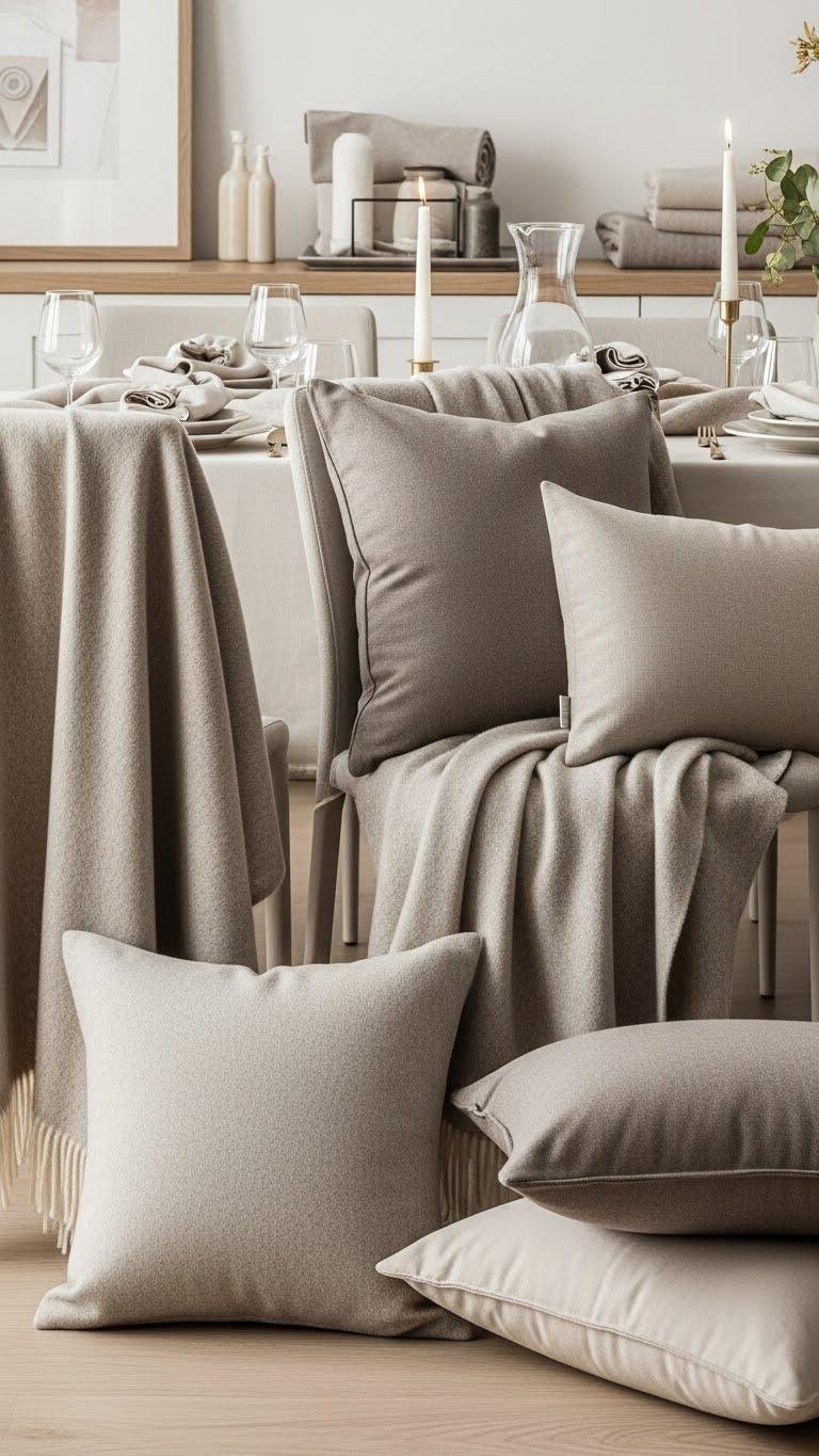 You’ll mix tactile layering—wool throws, linen cushions, subtle boucle—so surfaces read rich without shouting.