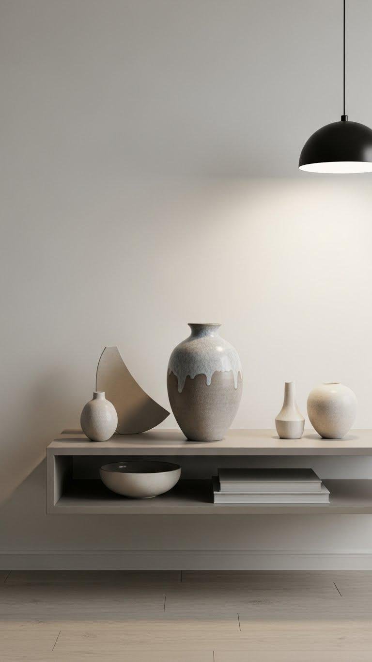 Let a single ceramic vase or sculptural object do the talking—placed with intention on a low-profile console or floating shelf, it brings quiet shape and texture without crowding the room.