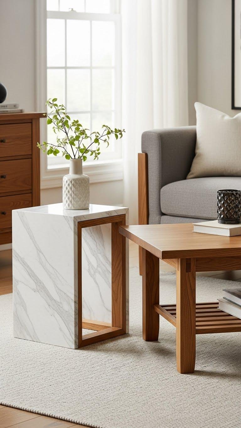 A single marble accent table and a solid wood coffee table can anchor your living room with balanced contrast: the marble brings cool, polished presence while the wood adds warmth and texture. You’ll lean into clean silhouettes, pick simple wood joinery for durability, and follow basic marble maintenance to keep surfaces pristine.