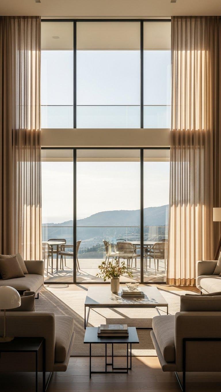 Why not make the view part of the room? Floor-to-ceiling windows expand space, flood clean lines with light, and connect you to outdoors. Sheer curtains soften glare while enabling solar control and effortless privacy zoning.