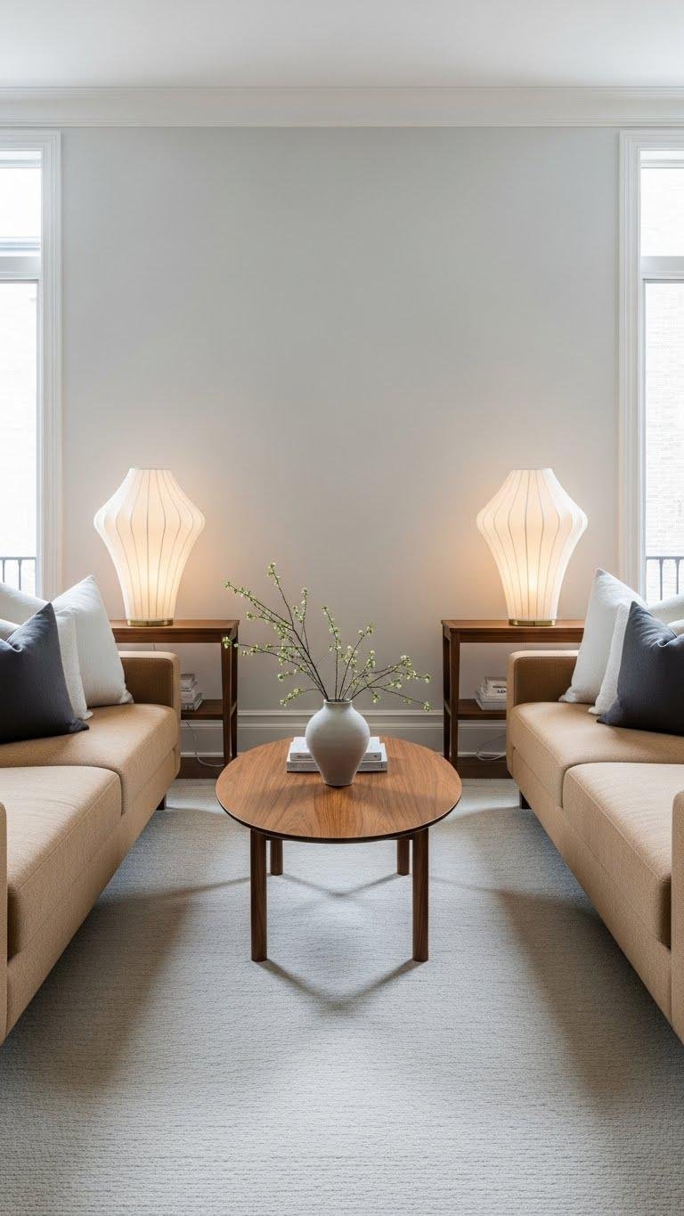 Anchor your seating with a mirrored arrangement—two identical sofas or a pair of chairs facing each other—and place matching lamps to bookend the composition. You’ll lean into lamp symmetry to create calm, balanced sightlines.