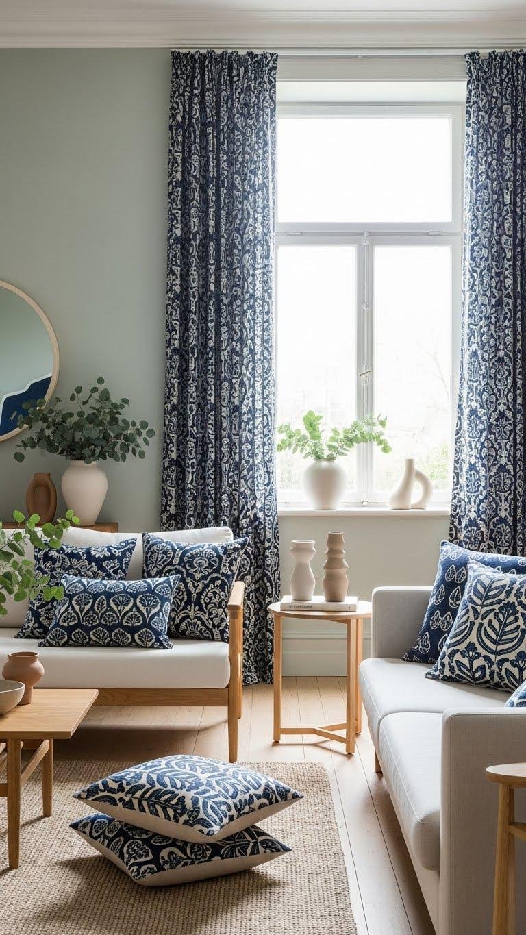 Choose block print pillows and drapery with indigo motifs to anchor airy greens and light woods. You’ll mix handmade charm with modern restraint, creating a liberated, polished space that feels intentional and fresh.
