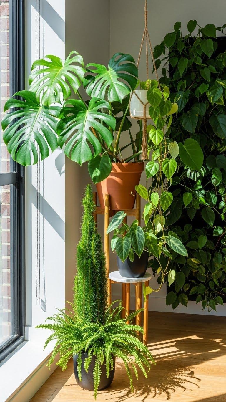 Choose bold specimens and mix textures—think broad large leafings paired with a slim fern—to create depth. Add a vertical greenwall or staggered pots to maximize height. You’ll craft a freeing, calm nook that feels modern, light, and effortlessly alive.