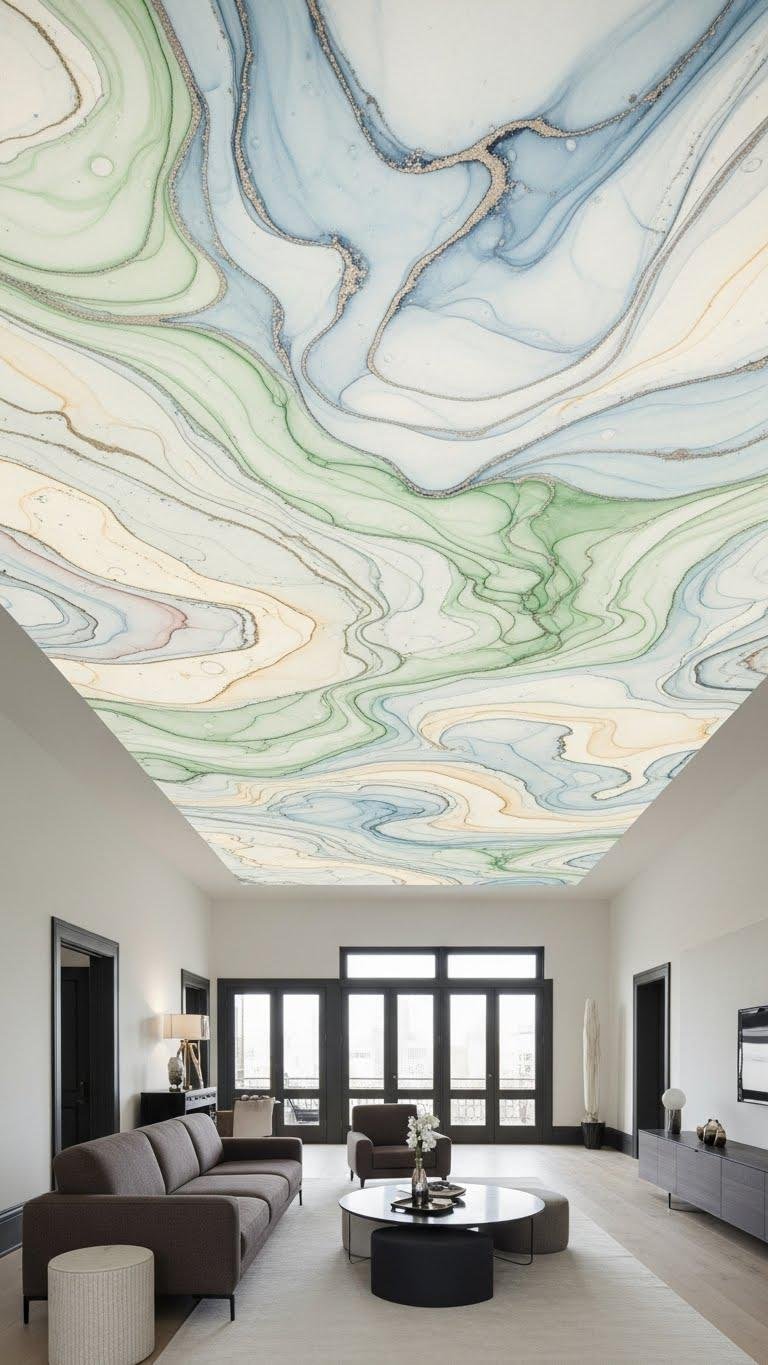 You can create a marbled ceiling or a soft kinetic fresco to draw the eye upward, expanding space and spirit.
