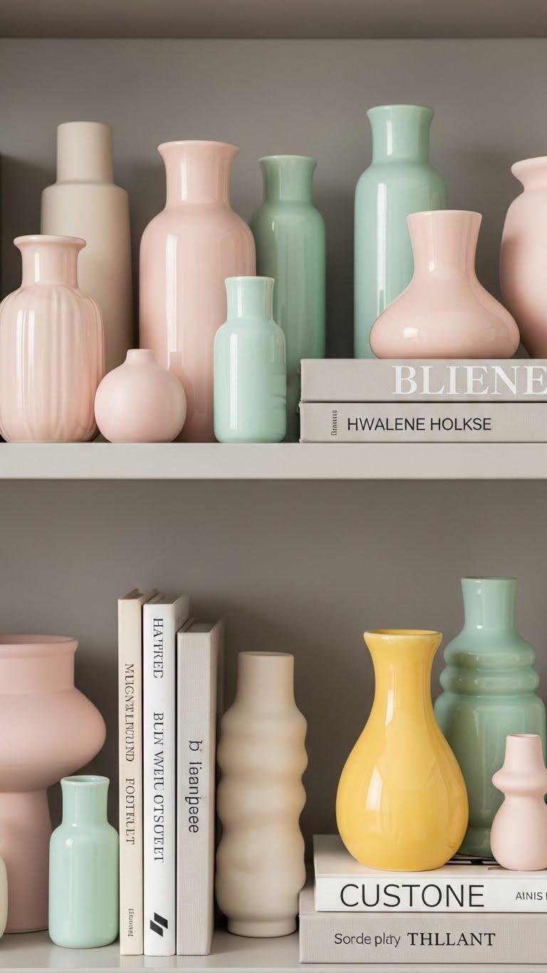 Begin with a handful of pastel ceramics—soft blush, mint, and buttery ochre—arranged like small sculptures amid neutral books so each piece can breathe. You’ll create pastel symmetry by balancing height, color, and negative space. Use ceramic trio arrangements on alternating shelves, mix matte and gloss, and keep titles muted. The result feels effortless, modern, and liberating.