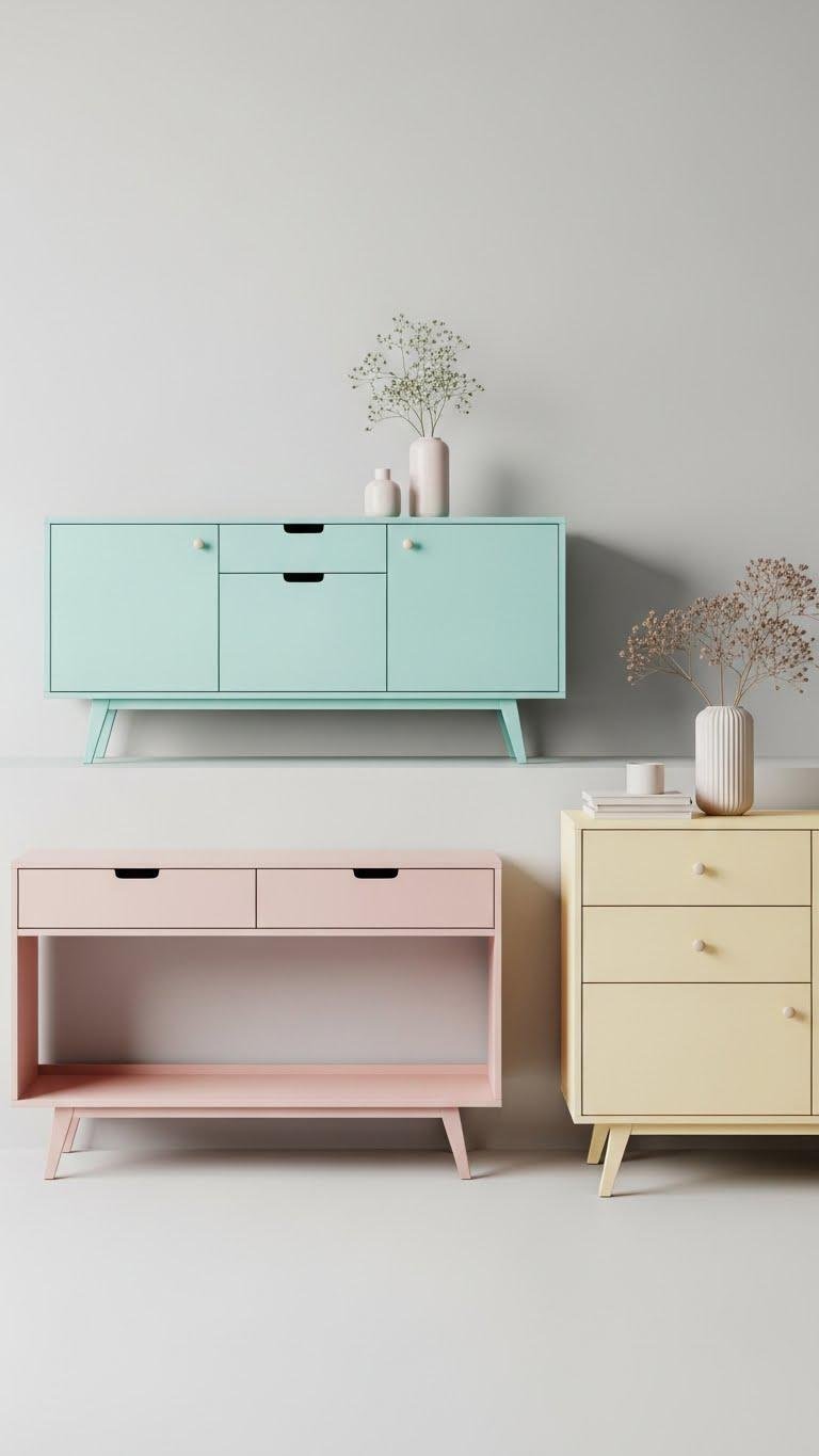Bring in a pastel-painted piece to lift the room’s neutral base—think a mint sideboard, blush console, or pale butter dresser that reads like art.