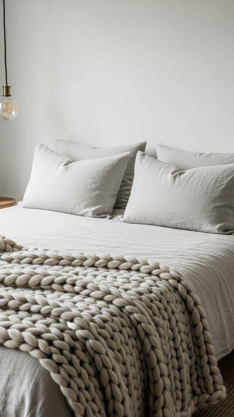 Often you’ll mix wool throws and linen covers to give your space depth and effortless charm; drape a chunky wool blanket over the foot of the bed and pair it with crisp linen pillowcases to balance warmth with breathability. Embrace wool layering for sculpted coziness, then use linen draping to keep things airy. You’ll create a minimalist, liberated vibe that feels tactile and intentional.