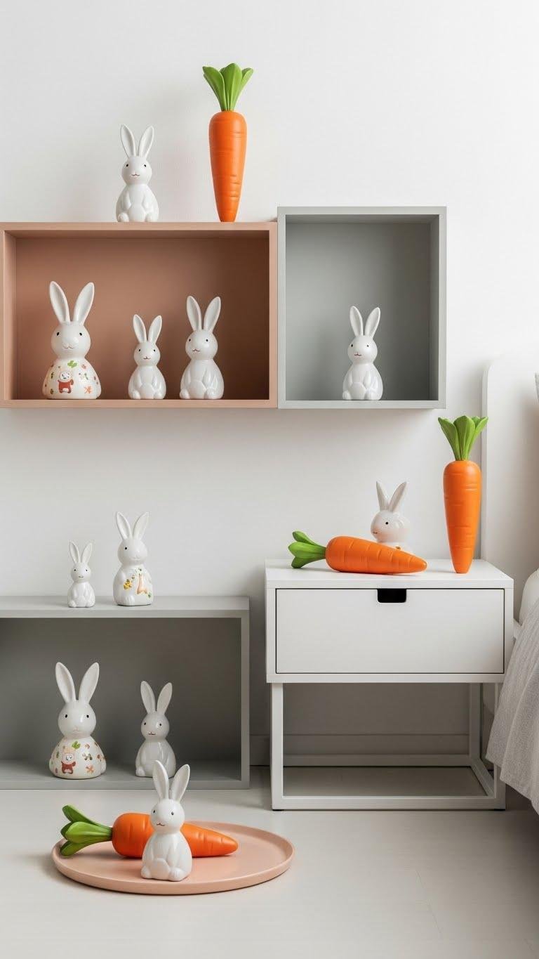 Mix in playful carrot sculptures for a sly, modern nod to nature. Keep groupings sparse, colors soft, and lines clean so your space feels airy and free.