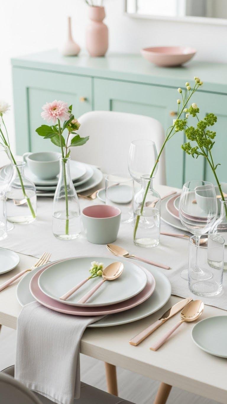 After you’ve let a mint sideboard or blush console set the room’s tone, carry that soft palette into the dining area with pastel tableware and vases.