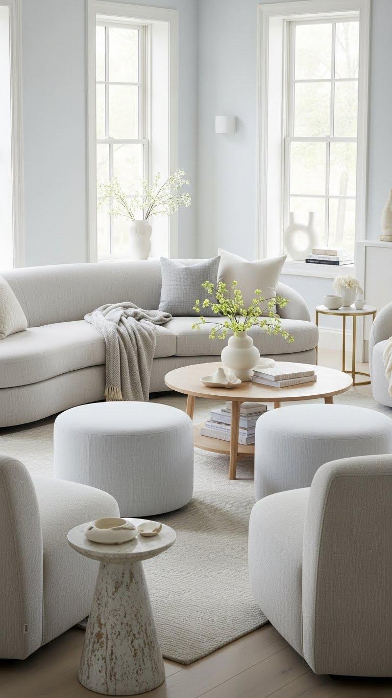 Favor low-profile curves for a modern, airy vibe; arrange pieces to spark curved conversation and connection. Add circular ottomans for flexible seating and sculptural impact.