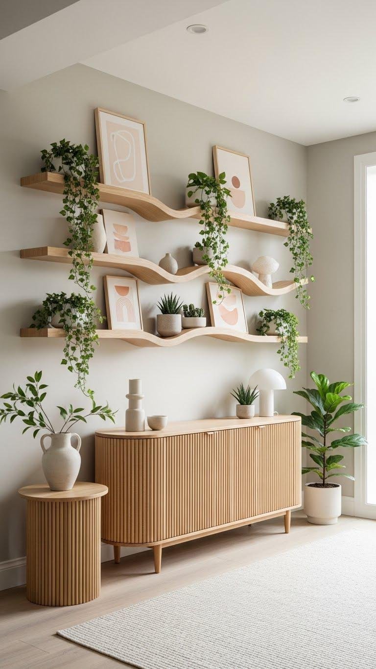 You can swap rigid angles for wavy brackets to float art and plants, and choose fluted cabinetry to add shadowed texture without heaviness.