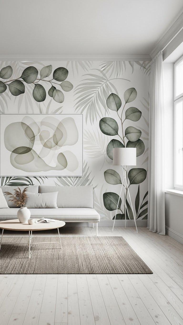 When you want to make a fresh, modern statement, choose oversized botanical wallpaper on a single accent wall to anchor the room without overwhelming it. Pick oversized eucalyptus or subtle palms in botanical murals to create depth and calm. You’ll keep the rest minimal — clean lines, airy neutrals — so the mural breathes and your space feels open, expressive, and free.