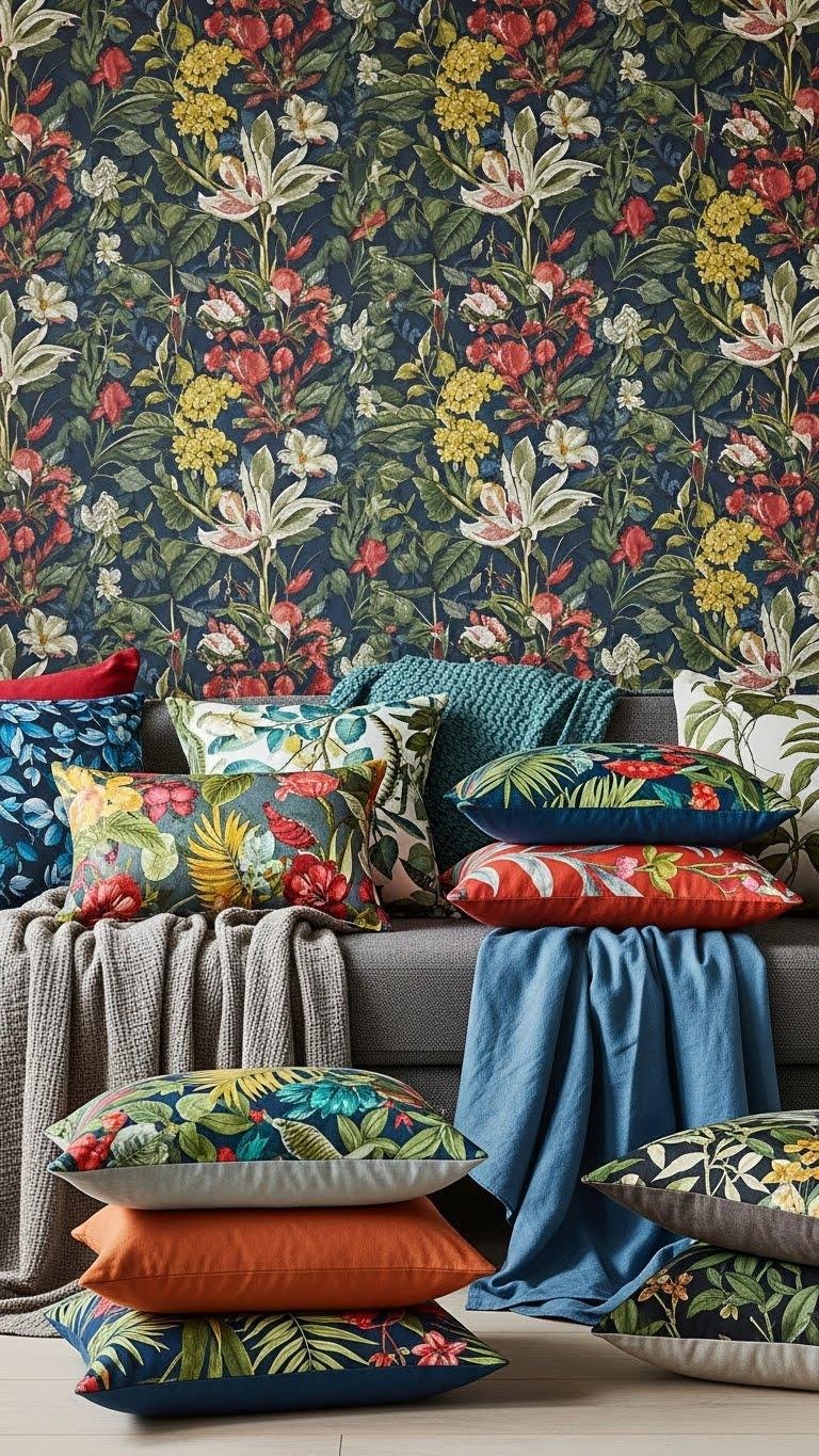 After anchoring a room with oversized botanical wallpaper, layer in texture and pattern by mixing bold botanical throw pillows and blankets to carry the motif through the space. You’ll mix tropical prints with solid pieces, play with contrasting textures like linen, boucle, and silk, and let pillows anchor seating while lightweight throws drape casually, giving your room an effortless, liberated spring vibe.