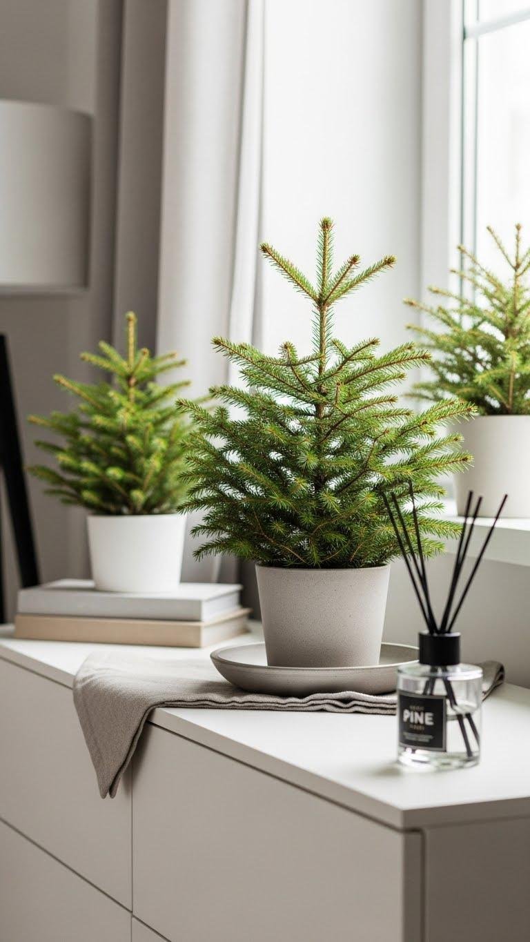 Bring in small potted evergreens to anchor your neutral scheme and inject fresh winter life. You’ll place a mini spruce centerpiece on a low dresser or windowsill, keeping lines clean and airy.