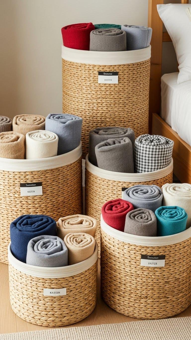 Woven-basket storage gives you a tidy, tactile way to keep extra blankets accessible without cluttering your neutral bedroom. Choose varying heights for vertical storage that frees floor space and creates sculptural warmth.