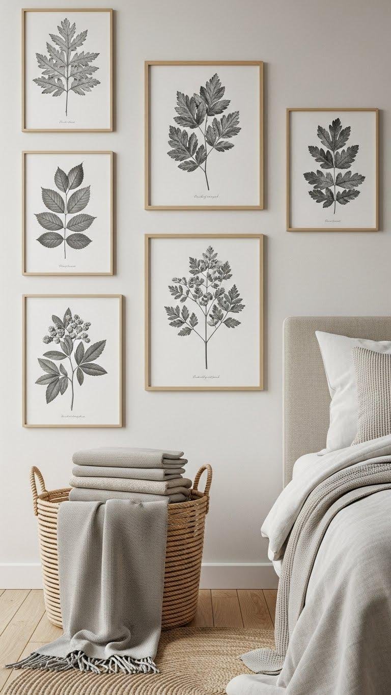 After you tuck blankets into woven baskets, soften the walls with botanical prints in muted tones to keep the room calm and cohesive.