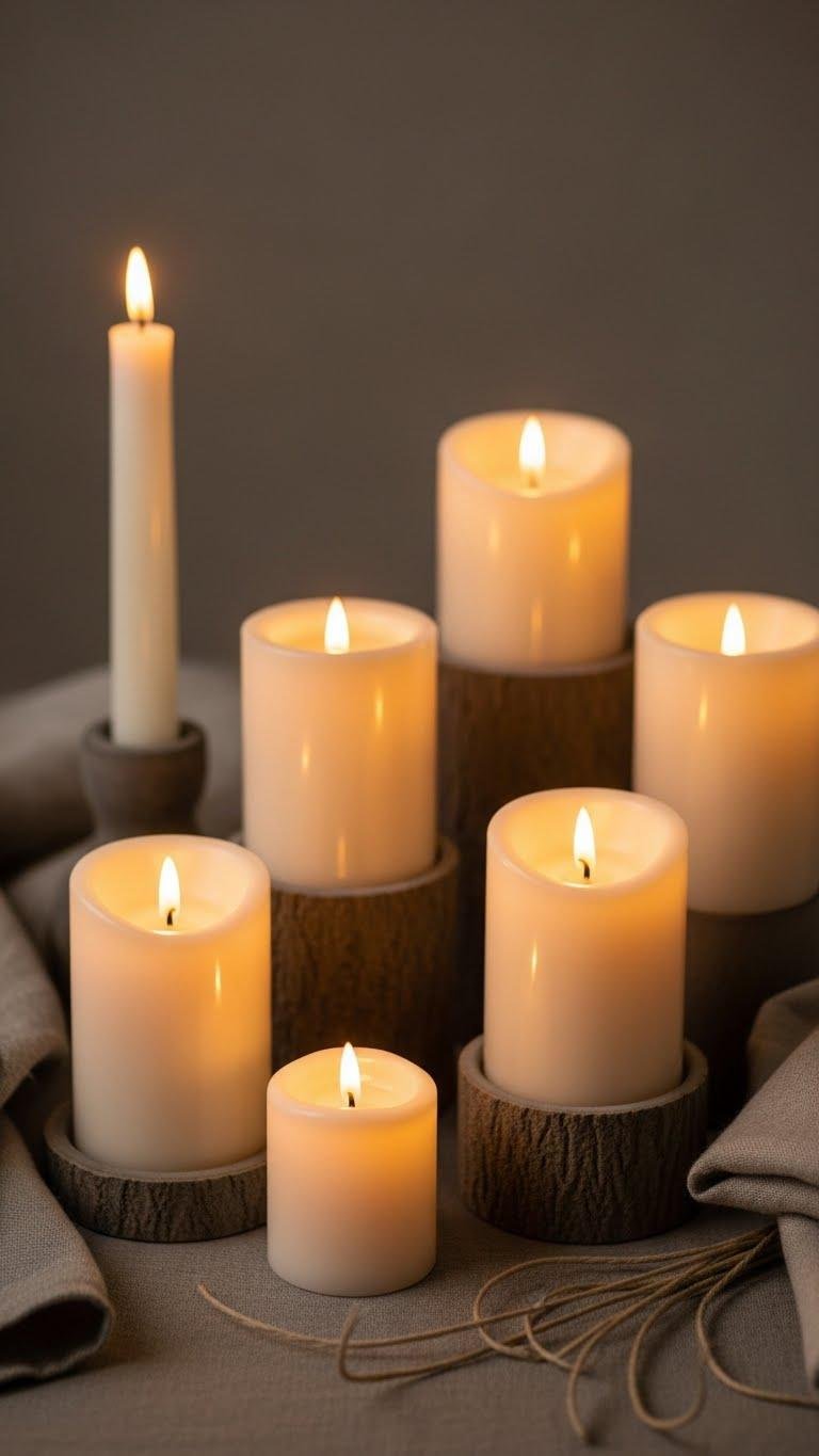 Bring in a cluster of LED candles or a small arrangement of real ones to add flickering warmth without disrupting a neutral palette. You’ll mix sizes and natural holders for a layered look, choose scent pairing that complements linen or wool, and follow safety tips: never leave flames unattended, trim wicks, and keep candles away from fabrics.