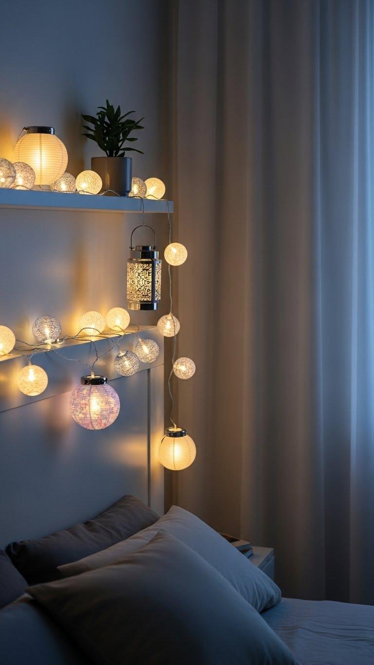 Drape soft fairy lights around a headboard, along a shelf, or behind a sheer curtain to create a diffuse, cozy glow that keeps a neutral palette calm and refined.
