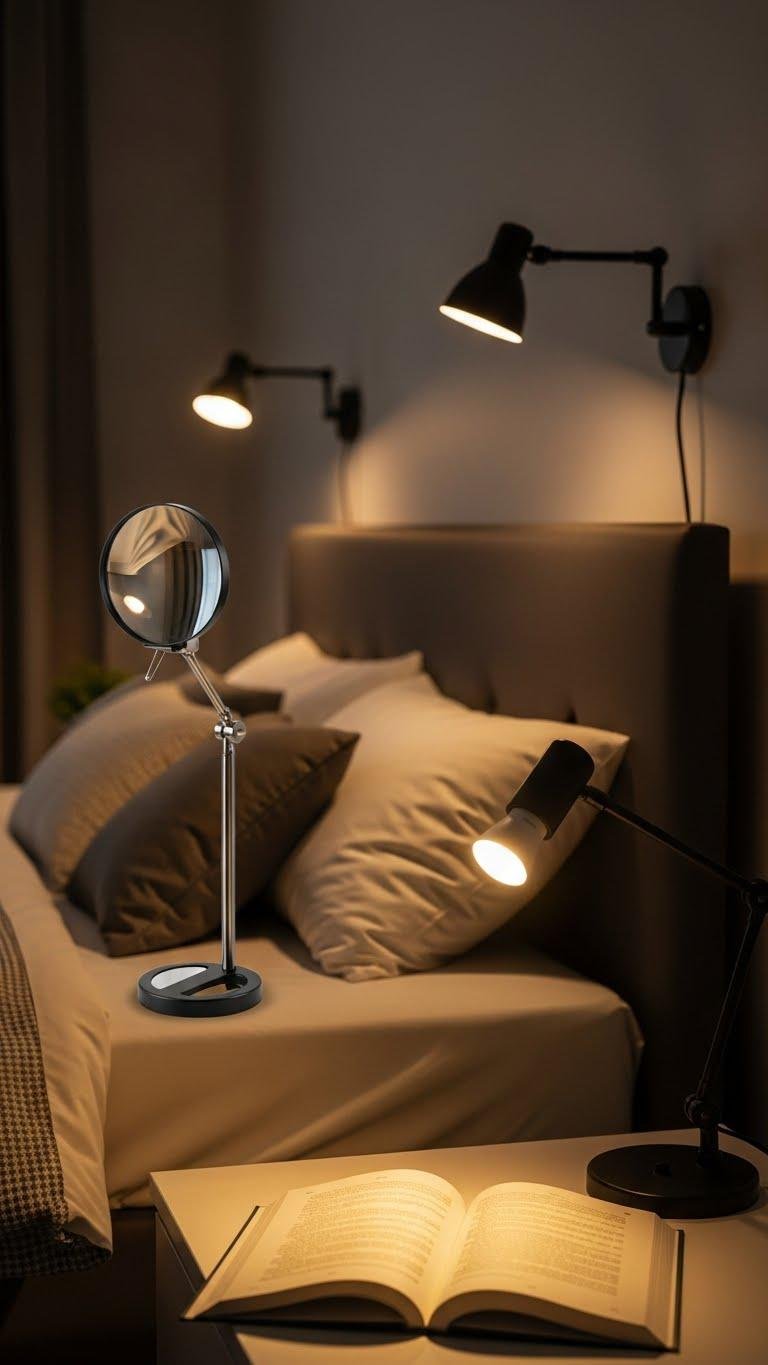 Add a task magnifier option if you read small print. This setup lets you linger in bed, customize angles, and keep the rest of the room softly dimmed.
