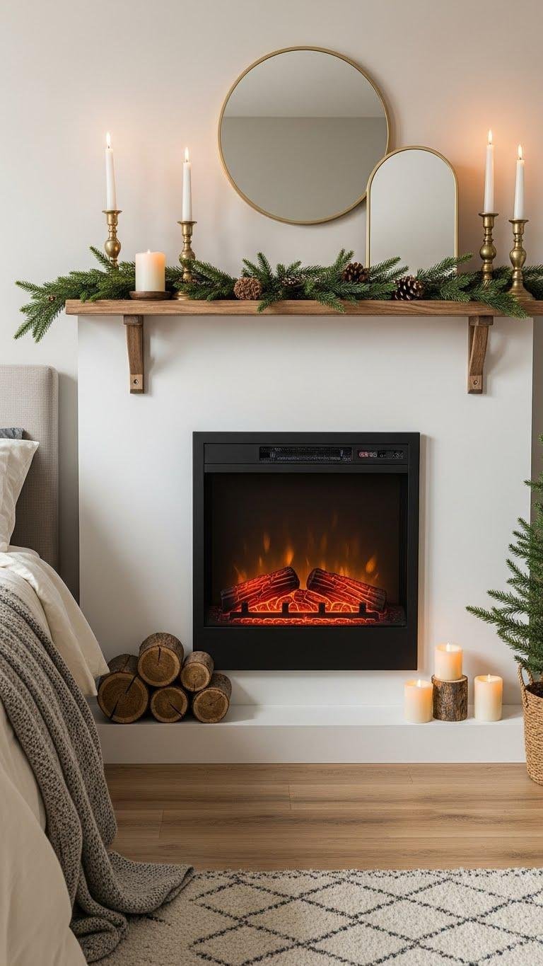 You’ll craft mantel styling that’s minimal and freeing: add a portable electric insert with an artificial flame, stagger logs, tuck seasonal greenery, and balance candles and mirrors for cozy, uncluttered impact.