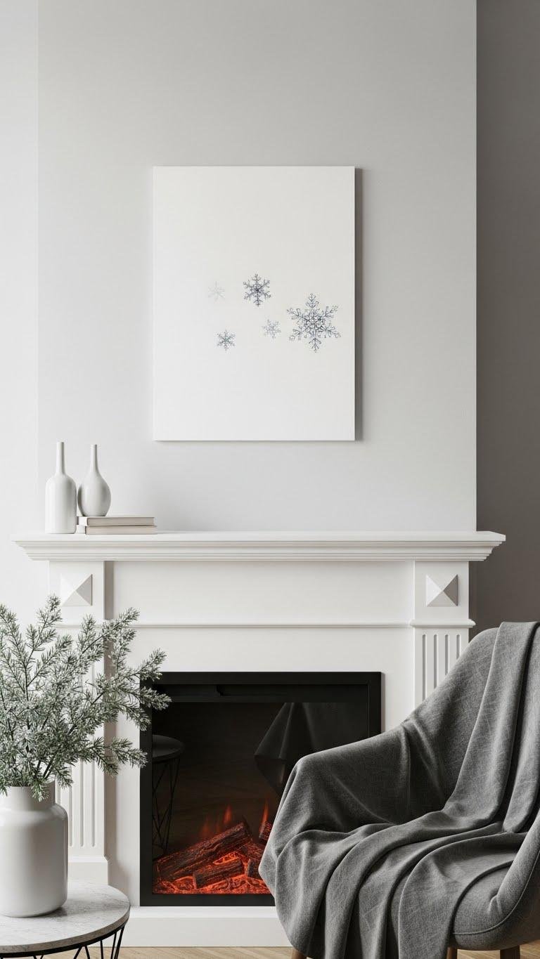 After you’ve warmed the room with a faux fireplace vignette, introduce subtle winter motifs sparingly so the space feels seasonal without becoming literal.