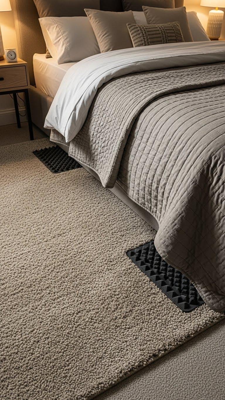You’ll anchor the space with neutral tones, add subtle grip using soundproofing mats underneath, and position bedside lighting to highlight texture—letting you move freely and luxuriate in tactile, calm winter comfort.