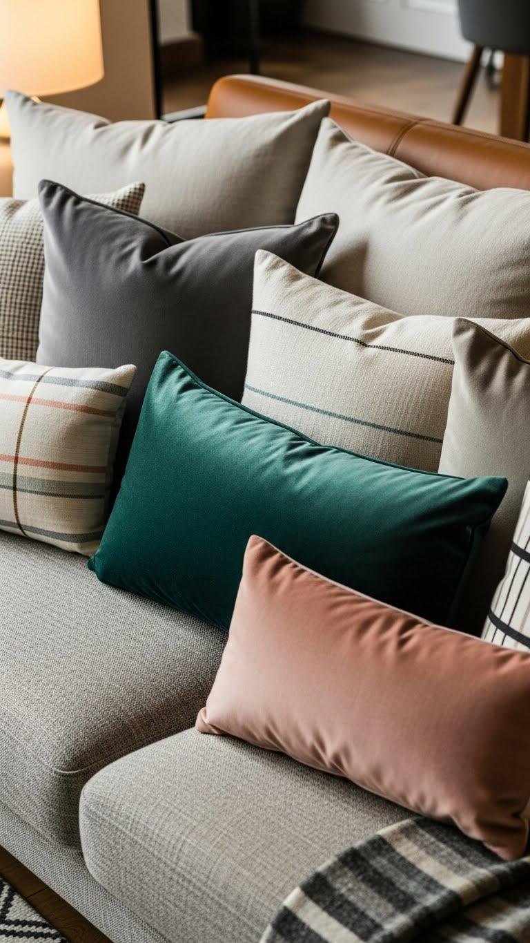Mix velvet and linen cushions to balance luxe depth with breathable texture—velvet brings a soft sheen and cozy weight, while linen keeps the look relaxed and layered. You’ll pair a velvet lumbar with neutral linen eurocase standards, alternating sizes and muted tones.