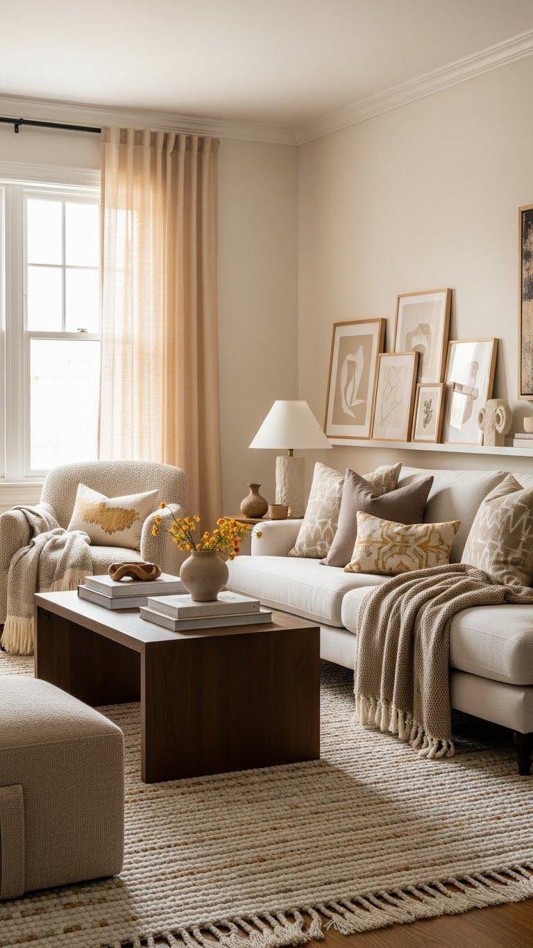 A warm cream or beige on the walls instantly sets a soft, flattering backdrop that makes furniture and textiles read richer without dominating the room. Choose a soft matte finish to keep glare low and surfaces tactile. Opt for tones with warm undertones so the space feels inviting yet airy.