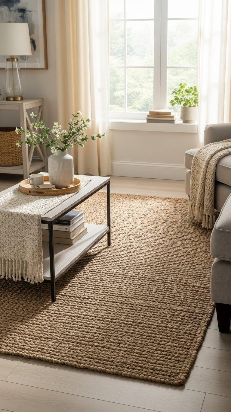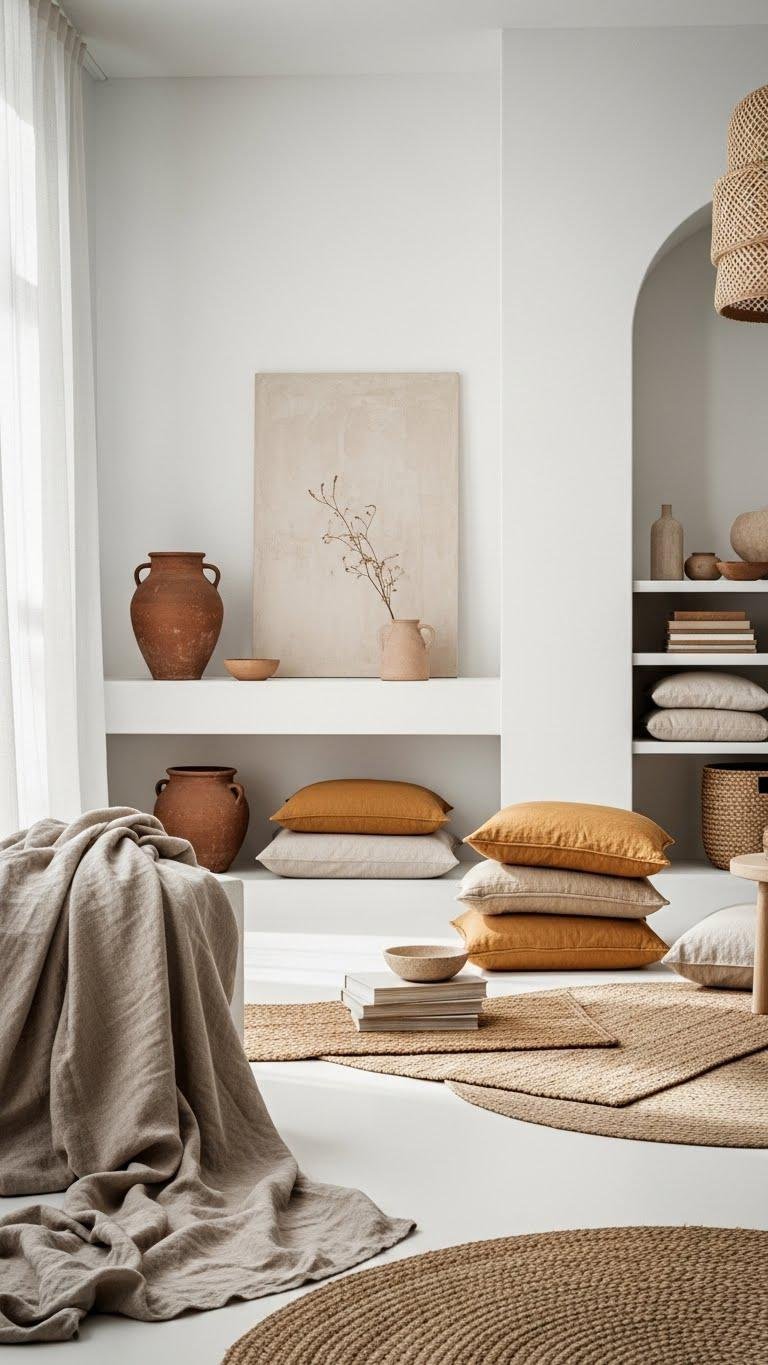 You’ll mix linen throws, sisal rugs, and soft plaster tones, punctuating with earthy terracotta pottery and muted ochre cushions. Let natural light sculpt texture; choose minimalist furniture and open storage so the room breathes.