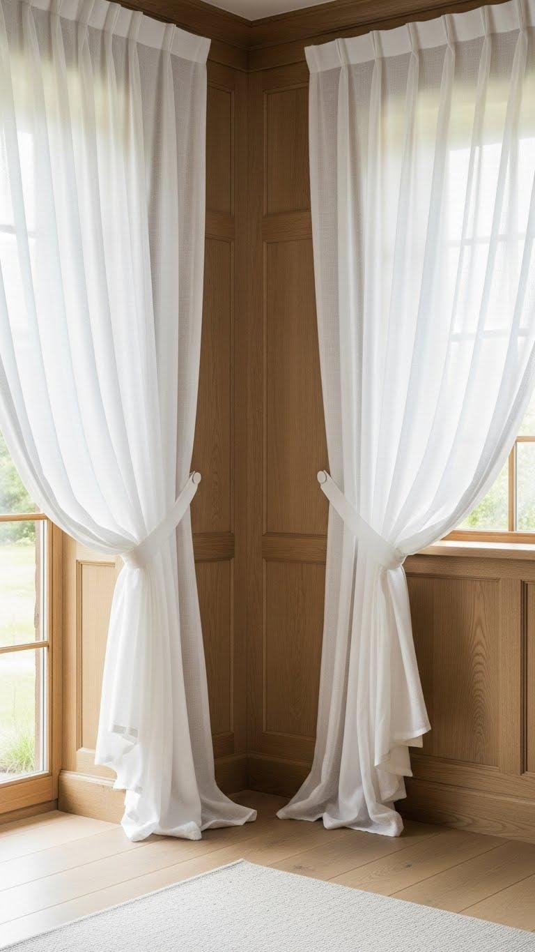 Pairing airy white curtains with the oak paneling keeps the room light and effortless, letting sun filter through soft folds that blur edges and lift the mood. You’ll choose sheer voile for gentle light diffusion, secure panels with linen ties, and welcome breezy movement that feels free. The result is tranquil, uncluttered, and visually open, encouraging calm and easy breathing.