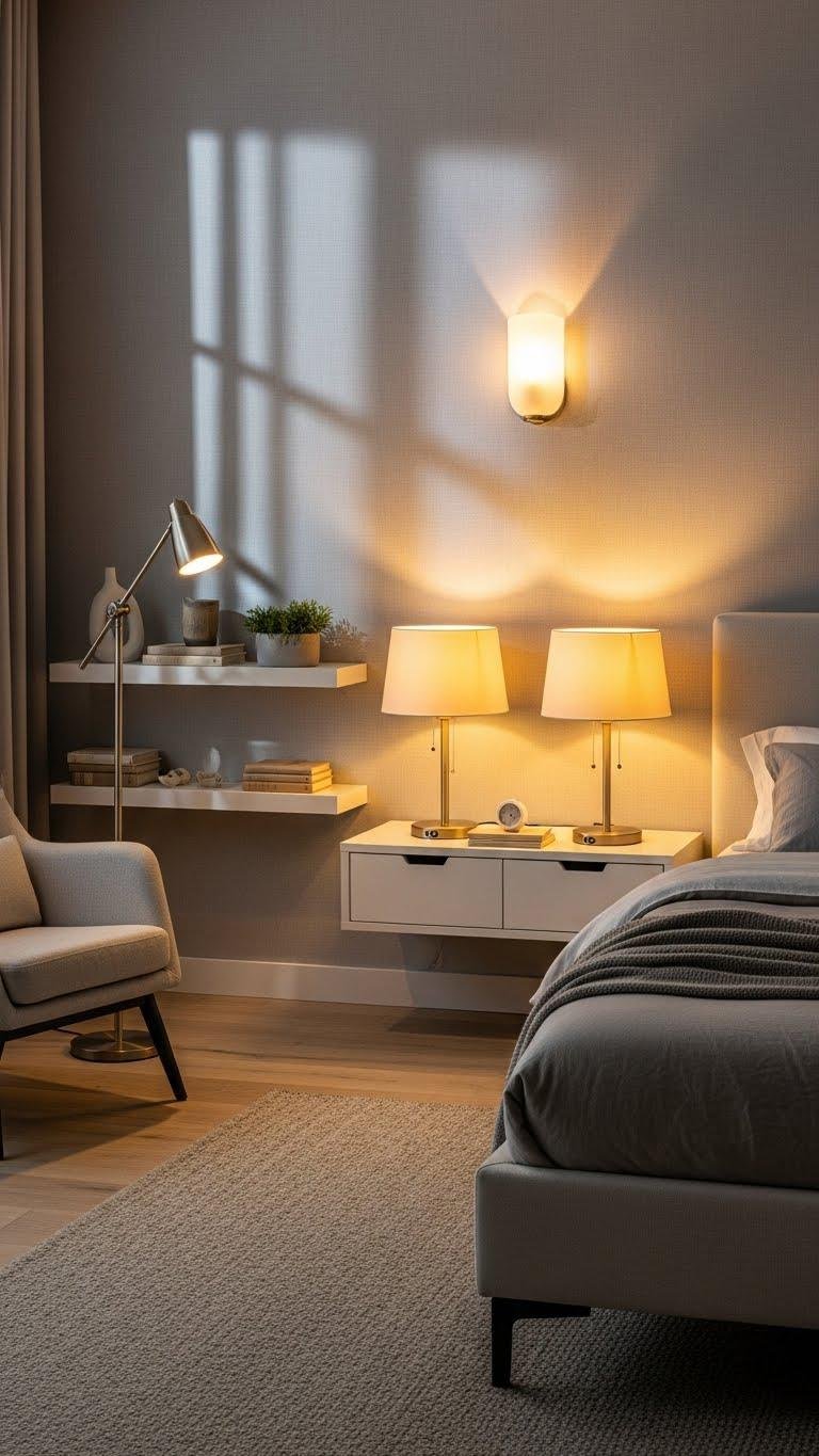 Often you’ll layer lighting to create depth and a gentle, lived-in glow: bedside lamps with warm bulbs anchor the bedside vignette, while a dimmable overhead or wall sconce fills shadows and a subtle floor lamp adds reading light.