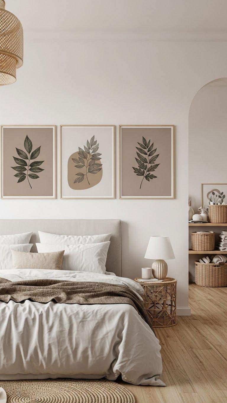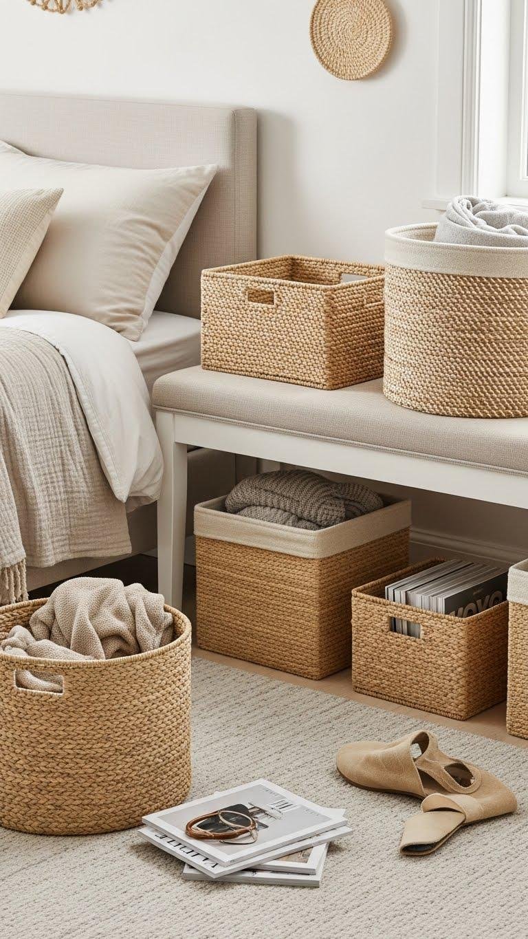 Woven-basket storage brings texture and order to a neutral bedroom, letting you corral blankets, magazines, and loose accessories without breaking the room’s calm. You’ll choose woven hampers and sisal bins to create visual rhythm, tuck them by the bed or under a bench, and keep surfaces clear.