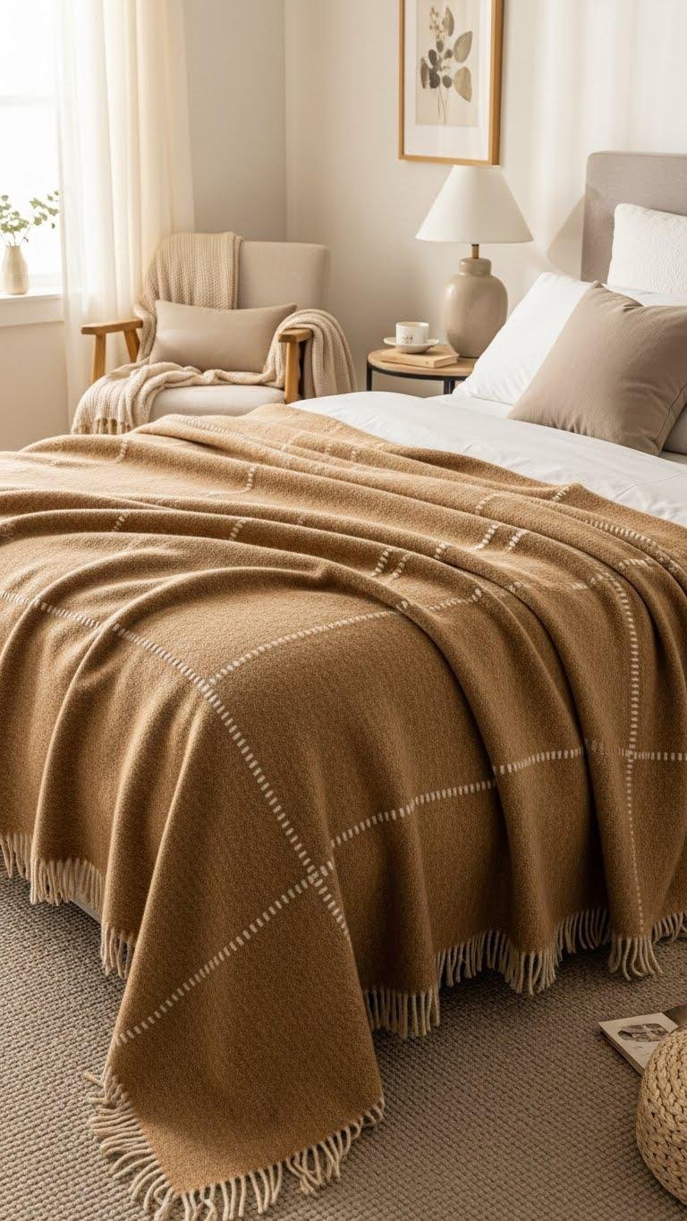 Often you’ll reach for a camel or tan throw to anchor the bed or chair, its textured weave adding quiet depth without stealing the room’s calm.