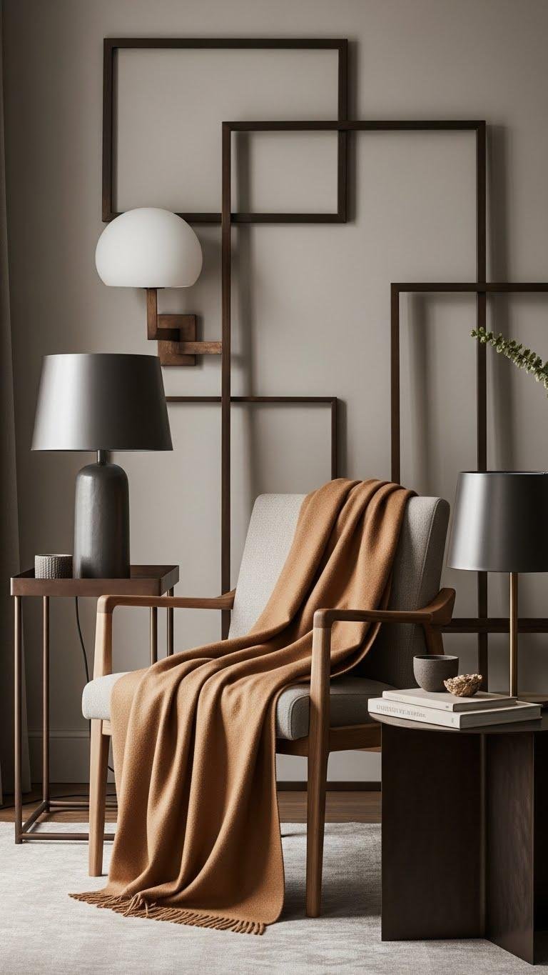 You’ll pair matte pewter lamps, oxidized steel frames, and slim hardware to anchor neutral tones. Choose minimal silhouettes and satin finishes for subtle gleam. This restrained mix gives your room refined depth, calm edges, and the freedom to breathe without clutter.